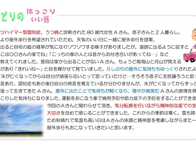 いつまでも自分らしく 暮らすために。 LIVING YOUR OWN WAY NEWS 2025.11.26 R7.11月の空き情報 一覧はこちら MESSAGE メッセージ 私たちリハビリ訪問看護ステーションみどりのスタッフは、地域に根付いた地域住民の方々のための訪問看護ステーションとしてあり続けられるよう、皆様方との一つひとつの「ご縁」を大切にしております。また、訪問看護師としてご自宅を訪問し、利用者様とご家族が自分らしい暮らしを快適に送れるよう、お手伝いさせていただきます。 看護師自身の気持ちや生活に余裕ができて、初めて良い看護ができるようになるというのが私たちの考えです。スタッフ一人ひとりが大切にしていることや家庭を第一に、細く長く働けるような体制と雰囲気作りを心がけております。 「困ったときはお互い様」の精神で、小規模だからこそスタッフ全員で対応できる、顔の見えるアットホームなステーションです。 詳しく見る WORK 事業内容 私たちが行っている訪問看護の内容を、メリットなども踏まえて詳しくご紹介いたします。利用者様ご本人はもちろん、ご家族や関係者の方にも満足いただけるサービスを提供させていただきます。 詳しく見る VOICE 事業者様の声 こちらのページでは、事業者様からいただいた喜びの声を一部ご紹介いたします。数多くの事業者様との、強固かつ豊富なつながりを活かして利用者様やご家族のご要望にスムーズに対応しています。 詳しく見る FLOW サービスの流れ 詳しく見る FAQ よくある質問 詳しく見る CONTENTS コンテンツ ほっこり ニュース 2025年度 2025.11.26 みどり広報 Vol.128 R7年11月1日 スタッフブログ 2025.10.12 認知症の親が一人暮らし…相談で見えた支援の形(Vol.2) ほっこり 2025年度 2025.10.12 みどり広報 Vol.127 R7年10月1日 一覧を見る ACCESS アクセス 施設名 リハビリ訪問看護ステーションみどり 営業時間 8:30~17:30 定休日 土曜、日曜、祝日、12/31、1/1、1/2、1/3、ほか事業所が定めた日 詳しく見る ACCESS アクセス 運営会社 有限会社モリヤオート 営業時間 9:00~17:30 定休日 日曜・祝日 電話番号 0235-25-8404 詳しく見る