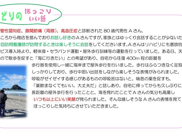 いつまでも自分らしく 暮らすために。 LIVING YOUR OWN WAY NEWS 2025.12.05 R7.12月の空き情報 一覧はこちら MESSAGE メッセージ 私たちリハビリ訪問看護ステーションみどりのスタッフは、地域に根付いた地域住民の方々のための訪問看護ステーションとしてあり続けられるよう、皆様方との一つひとつの「ご縁」を大切にしております。また、訪問看護師としてご自宅を訪問し、利用者様とご家族が自分らしい暮らしを快適に送れるよう、お手伝いさせていただきます。 看護師自身の気持ちや生活に余裕ができて、初めて良い看護ができるようになるというのが私たちの考えです。スタッフ一人ひとりが大切にしていることや家庭を第一に、細く長く働けるような体制と雰囲気作りを心がけております。 「困ったときはお互い様」の精神で、小規模だからこそスタッフ全員で対応できる、顔の見えるアットホームなステーションです。 詳しく見る WORK 事業内容 私たちが行っている訪問看護の内容を、メリットなども踏まえて詳しくご紹介いたします。利用者様ご本人はもちろん、ご家族や関係者の方にも満足いただけるサービスを提供させていただきます。 詳しく見る VOICE 事業者様の声 こちらのページでは、事業者様からいただいた喜びの声を一部ご紹介いたします。数多くの事業者様との、強固かつ豊富なつながりを活かして利用者様やご家族のご要望にスムーズに対応しています。 詳しく見る FLOW サービスの流れ 詳しく見る FAQ よくある質問 詳しく見る CONTENTS コンテンツ ほっこり 2025年度 2025.12.01 みどり広報 Vol.129 R7年12月1日 ほっこり ニュース 2025年度 2025.11.26 みどり広報 Vol.128 R7年11月1日 スタッフブログ 2025.10.12 認知症の親が一人暮らし…相談で見えた支援の形(Vol.2) 一覧を見る ACCESS アクセス 施設名 リハビリ訪問看護ステーションみどり 営業時間 8:30~17:30 定休日 土曜、日曜、祝日、12/31、1/1、1/2、1/3、ほか事業所が定めた日 詳しく見る ACCESS アクセス 運営会社 有限会社モリヤオート 営業時間 9:00~17:30 定休日 日曜・祝日 電話番号 0235-25-8404 詳しく見る