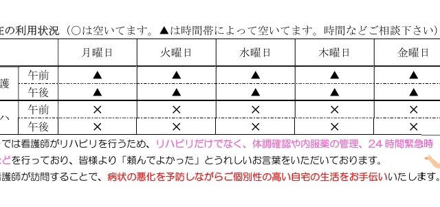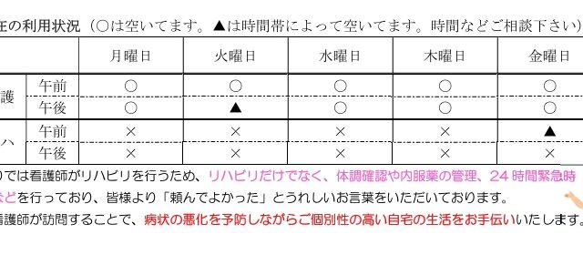 お知らせ NEWS ホーム お知らせ 2025.10.12 リハビリスタッフの求人について 2025.10.12 R7.10月の空き情報 2025.10.12 R7.10月のお休みについて 2025.09.26 R7.9月のお休みについて 2025.09.26 R7.9月の空き情報 2025.08.11 R7.8月の空き情報 2025.08.05 8月のお休みについて 2025.03.10 Webサイトを公開いたしました