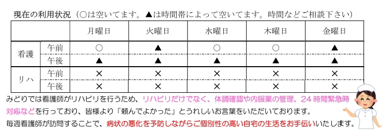 お知らせ NEWS ホーム お知らせ R8.1月の空き情報 2026.01.06 R8.1月の空き情報 現在、看護師の訪問枠に空きがございます。 冬期間は活動量も低下し、下肢の筋力低下や体調を崩しやすいです。 定期的に看護師が訪問することで、体調の確認や廃用予防のリハビリなどを提供することができます。 是非、訪問看護をご利用ください。 一覧へ戻る